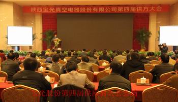 2012年12月13日,寶光股份第四屆供方大會(huì)在寶雞東高新區(qū)萬福七星國際酒店隆重召開。寶光集團(tuán)董事長、黨委書記、寶光股份總經(jīng)理李軍望,寶光股份副總經(jīng)理張軍、袁軍為,財(cái)務(wù)總監(jiān)蔣華明,及公司主要職能部門和生產(chǎn)單元相關(guān)單位領(lǐng)導(dǎo)和來自全國各地共81家的180多位供應(yīng)商代表參加了會(huì)議。大會(huì)由采購部副部長武永澤主持。