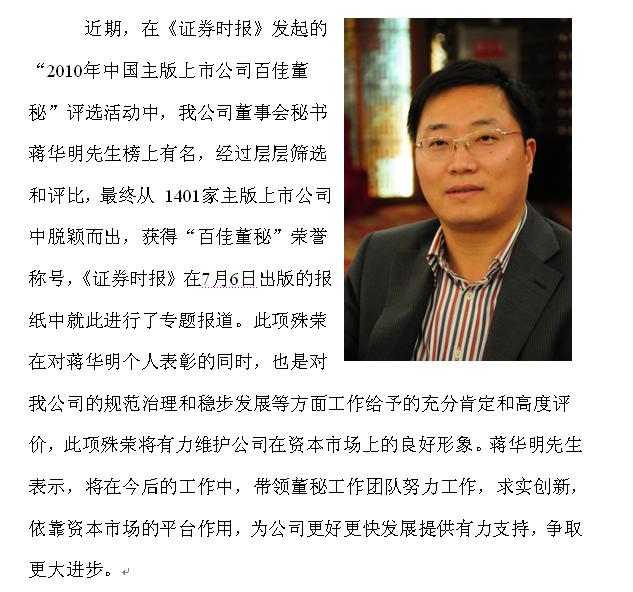 我公司董事會(huì)秘書(shū)蔣華明先生獲得“百佳董秘”榮譽(yù)稱號(hào)
