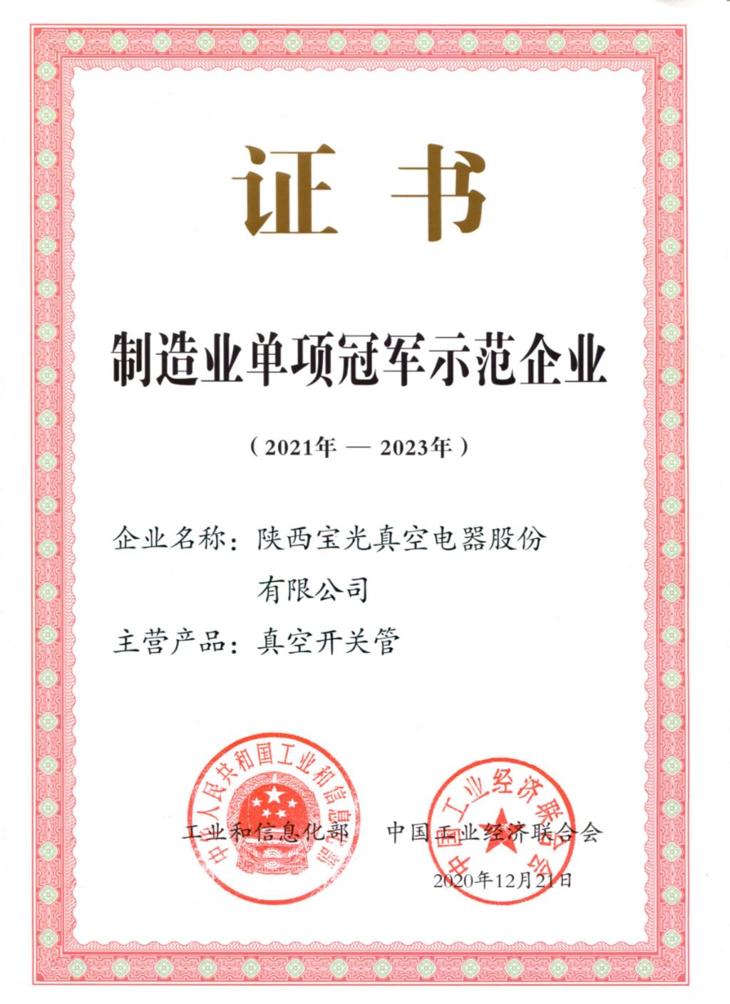 日前,陜西寶光真空電器股份有限公司(以下簡稱“寶光股份”)繼2017年入選制造業單項冠軍后,順利通過工業和信息化部與中國工業經濟聯合會復核,蟬聯“制造業單項冠軍示范企業(2021-2023)”。